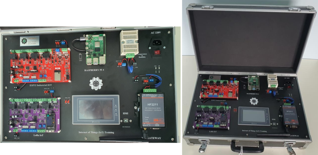 Raspberry Pi, ESP32, LoRa, MQTT, Node‑RED, HMI in one portable case.