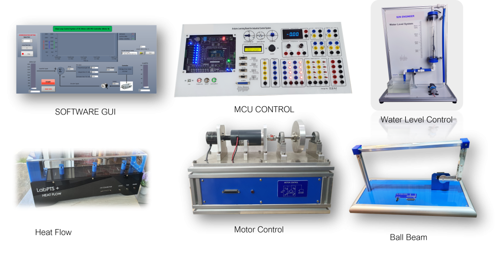 From software GUI → hardware control → real experiments: motor, water level, heat flow.